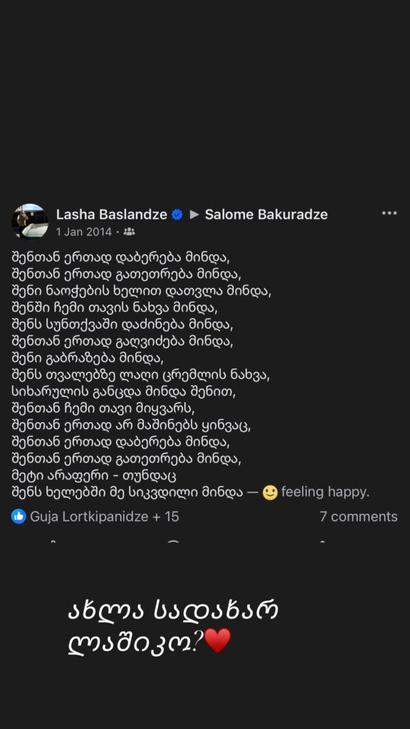 „ახლა სად ხარ ლაშიკო?… მიყვარხარ ჩემო ლაშიკო … სულ მიყვარხარ ჩემო ცაო… ეს სიმღერა და სულ ყველაფერი შენია ჩემო ლაშიკო “, – წერს სალომე ბაკურაძე და ფოტოებს აქვეყნებს.